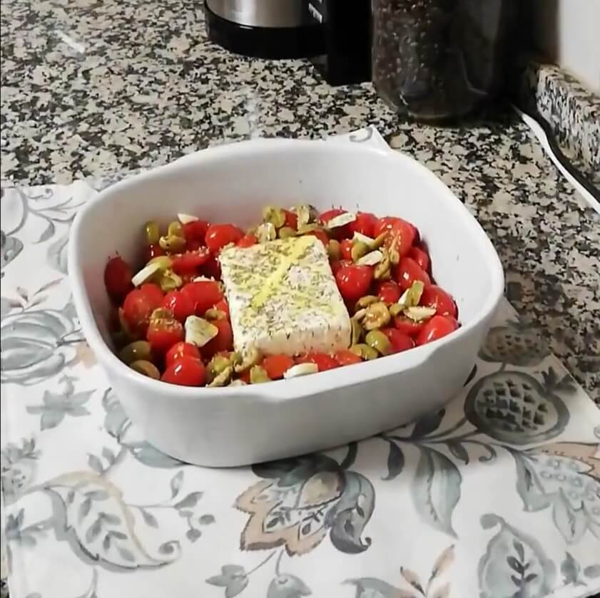 Coloque o bloco de queijo Feta em um recipiente que possa ir ao forno. Acrescente os tomates Cereja, as azeitonas e lâminas de alho. Polvilhe os temperos de sua preferência. Por fim regue com azeite. Leve ao forno pré-aquecido a 180°, por cerca de 20 minutos. Enquanto isso, cozinhe a massa conforme instruções da embalagem. Escorra e reserve. Passados os 20 minutos, retire o recipiente do forno. Misture o queijo e demais ingredientes assados para formar o molho; incorpore à massa. Sirva quentinho!