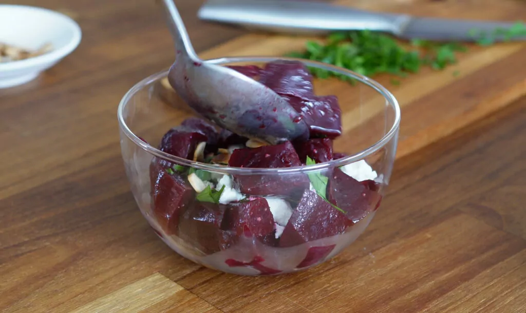 Essa salada de beterraba é perfeita para ter na geladeira e compor um almoço refrescante e saudável, é uma receita que não tem grandes obrigações além das próprias beterrabas, é ótima para testar substituições, por exemplo, no lugar do aceto balsâmico você pode utilizar outros vinagres, como zerez, ou até mesmo um pouco de suco de limão, o importante é trazer um pouco de acidez.